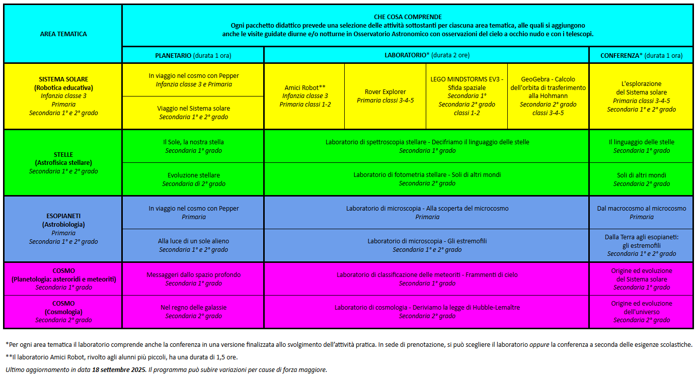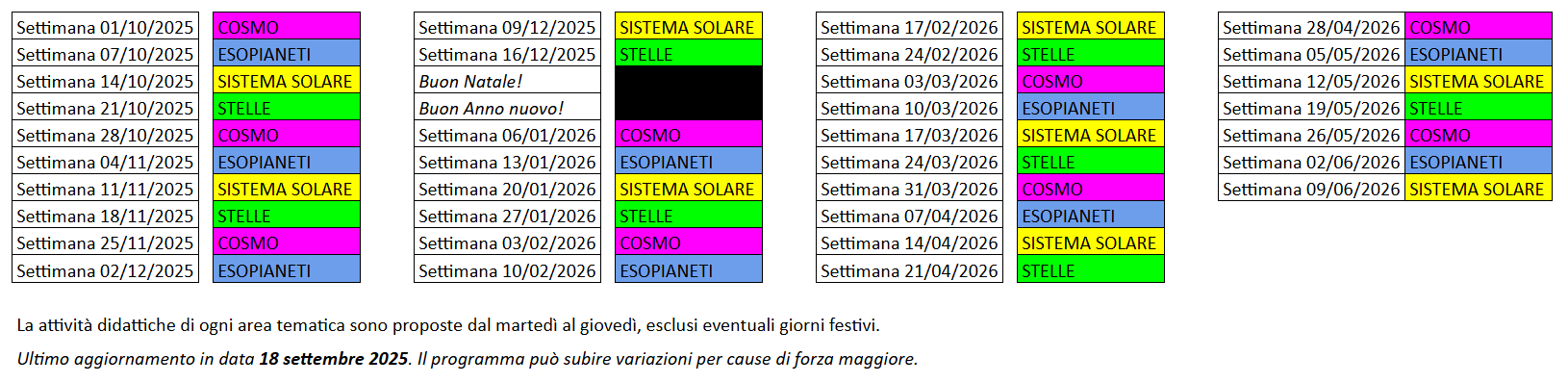 Le aree tematiche individuate per l’anno scolastico 2025-2026 sono: Sistema solare, Stelle, Esopianeti, Galassie, Cosmo. Vengono esposte seguendo un calendario prefissato in anticipo. Ciascuna area tematica contempla spettacoli immersivi al Planetario di Lignan dotato di un sistema di proiezione digitale 4K, laboratori che spaziano dalle osservazioni al microscopio e l’analisi di dati astrofisici alle applicazioni di robotica educativa e alla classificazione delle meteoriti, conferenze con l’esperto, visite guidate diurne e notturne in Osservatorio Astronomico con osservazioni del cielo a occhio nudo e con i telescopi nel primo Starlight Stellar Park in Italia. Linguaggio e contenuti sono declinati in funzione dell’età e della preparazione dei partecipanti. Potrete leggere una breve descrizione di ogni attività selezionando dal menu a tendina la tipologia di scuola di interesse tra Infanzia, Primaria, Se