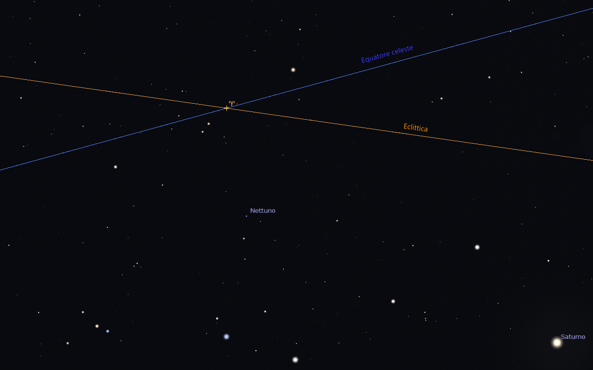 Nettuno. L’ultimo pianeta è assai lento nel suo moto apparente sulla volta celeste, permanendo per tutto il mese nella costellazione dei Pesci, proprio nella zona che confina con quella dell’Acquario dove c’è Saturno, in un curioso contraltare tra pianeti giganti del Sistema solare esterno. Mentre Saturno è visibile a occhio nudo, però, per apprezzare Nettuno serve necessariamente un telescopio. Possiamo provare l’osservazione nella prima parte della notte, con le stesse indicazioni orarie del pianeta con gli anelli. Curiosità: appena a nord di Nettuno si trova il “punto gamma”, o “primo punto d’Ariete”, un riferimento immateriale che indica la posizione che il Sole occupa in cielo all’equinozio della primavera boreale, quando nel suo moto apparente lungo l’eclittica attraversa l’equatore celeste. Viene anche detto “punto d’Ariete” perché in passato, duemila anni fa, si trovava all’interno di quella costellazione zodiacale; lo spostamento nella costellazione dei Pesci, dove si trova oggi, è dovuto al moto di precessione dell’asse di rotazione della Terra.