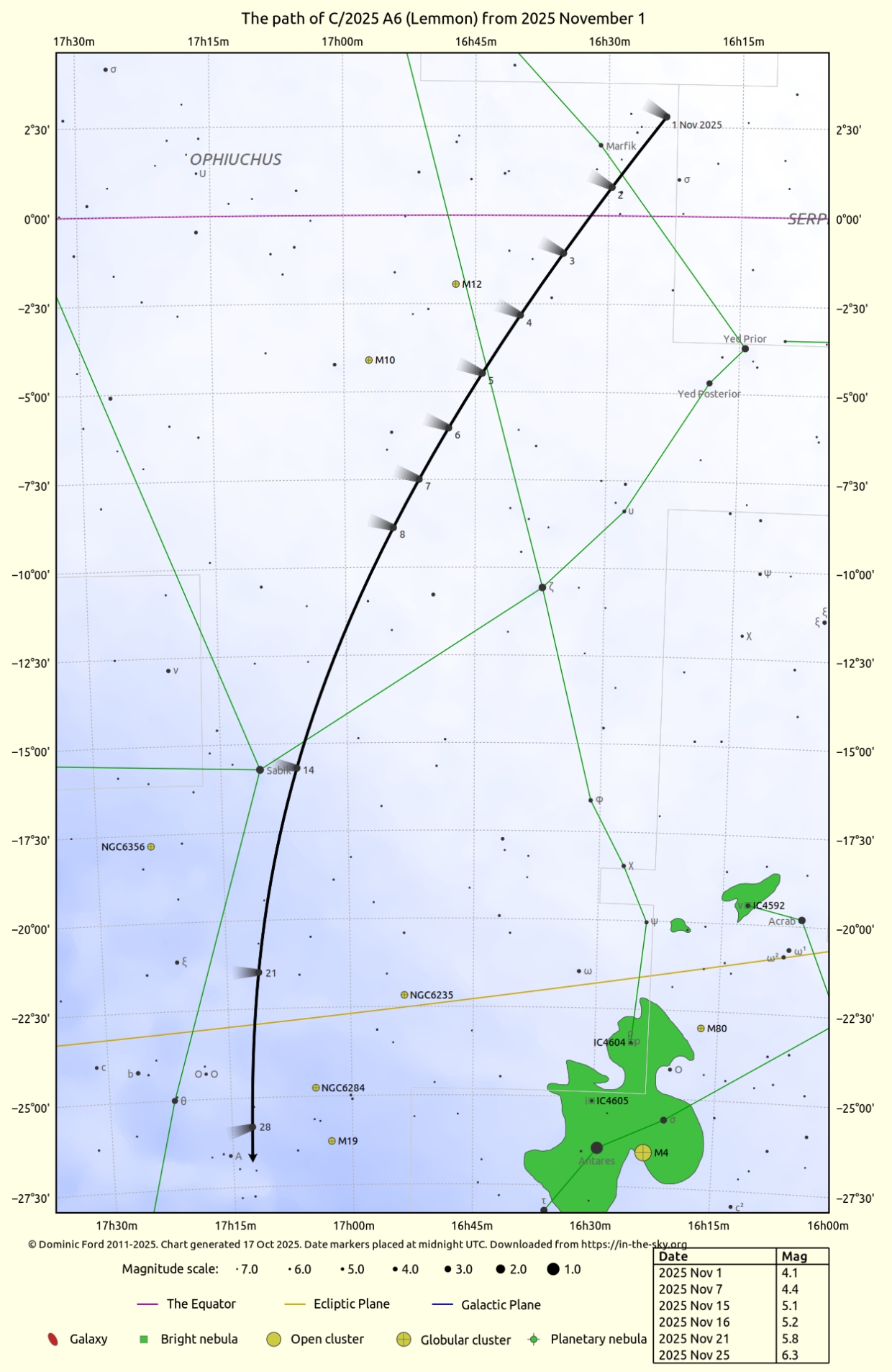 Salutata la Terra, la cometa C/2025 A6 (Lemmon) continua il suo percorso verso il Sole, arrivando al perielio l’8 novembre, a poco meno di 80 milioni di km dalla nostra stella. La potremo seguire, sempre più debole, mentre si sposta nella costellazione dell’Ofiuco, guardando a nord ovest subito dopo il tramonto, finché dal 21 novembre gli osservatori dell’emisfero terrestre boreale non saranno più in condizione di osservarla.