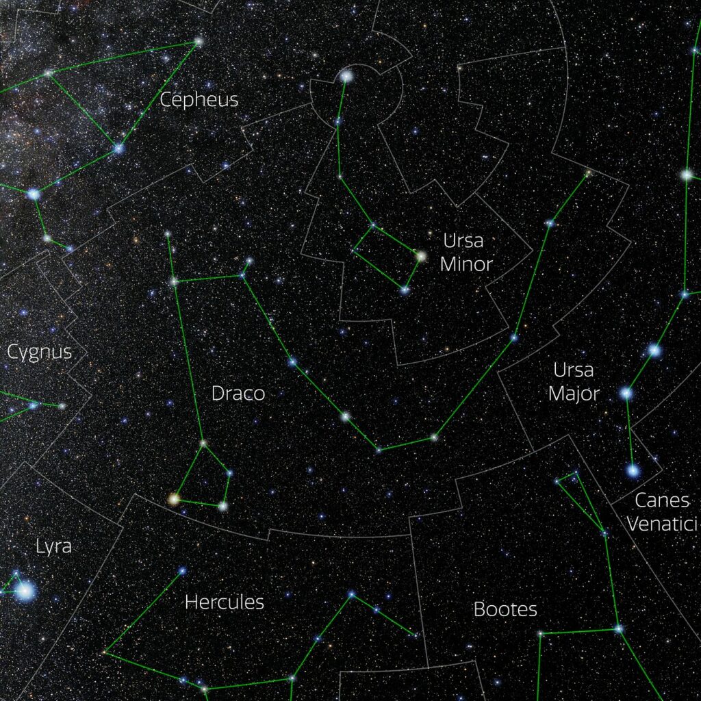 Tra l’Orsa Minore, che ospita il polo nord celeste, e l’Orsa Maggiore si snoda una costellazione molto antica, dalla forma che assomiglia alla lettera esse rovesciata. Si tratta del Drago dalla lunga e sinuosa coda, chiamato anche Dragone, perché il suo nome ufficiale in latino, Draco, coniuga il genitivo in Draconis.
