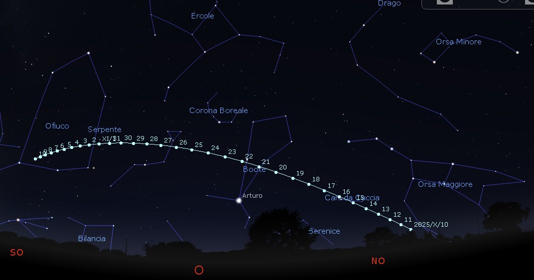 La posizione della cometa C/2025 A6 LEMMON alle 19.30 di tempo civile dal 10 ottobre al 10 novembre. L’immagine è generata con il software Stellarium.
