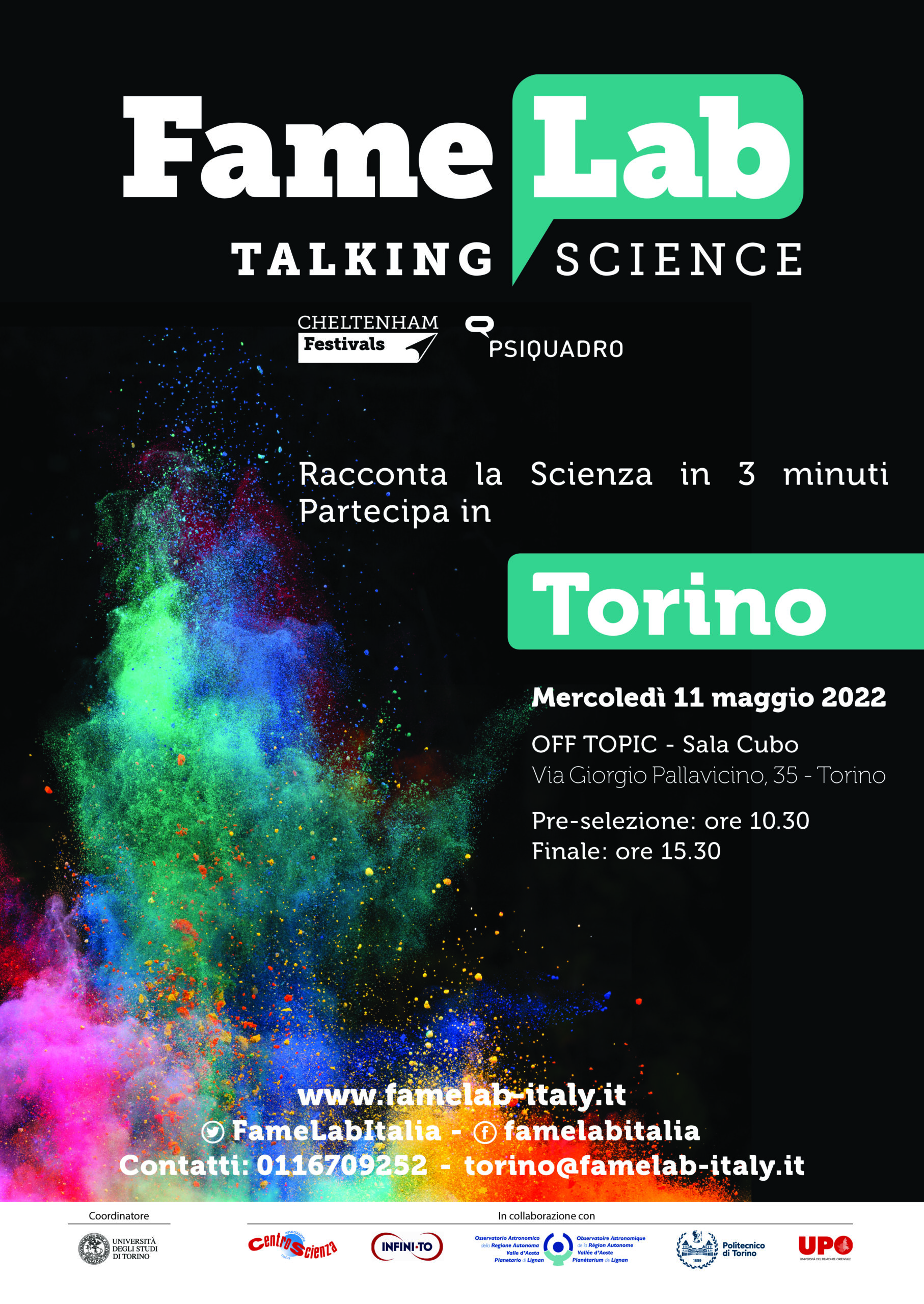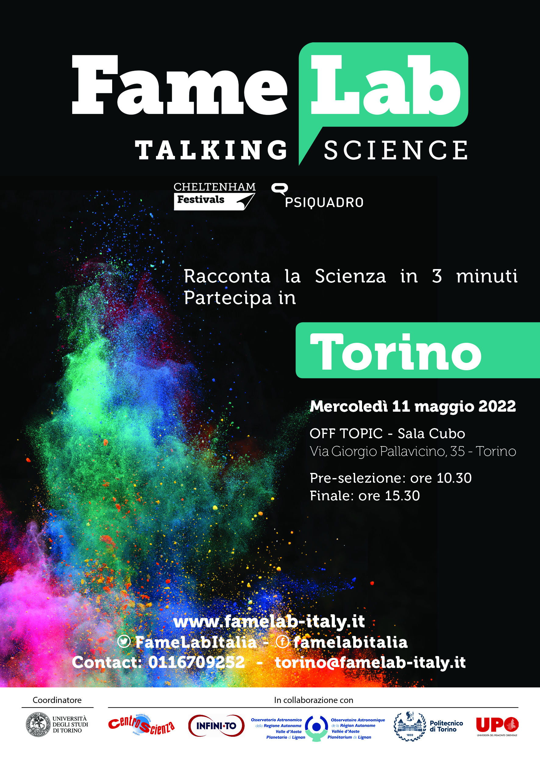 La selezione FameLab Torino è coordinata dall’Università degli Studi di Torino in collaborazione con Associazione Centro Scienza Onlus, Associazione Apriti Cielo – Infini.to, Osservatorio Astronomico della Regione Autonoma Valle d’Aosta e Planetario di Lignan, Politecnico di Torino e Università del Piemonte Orientale.
