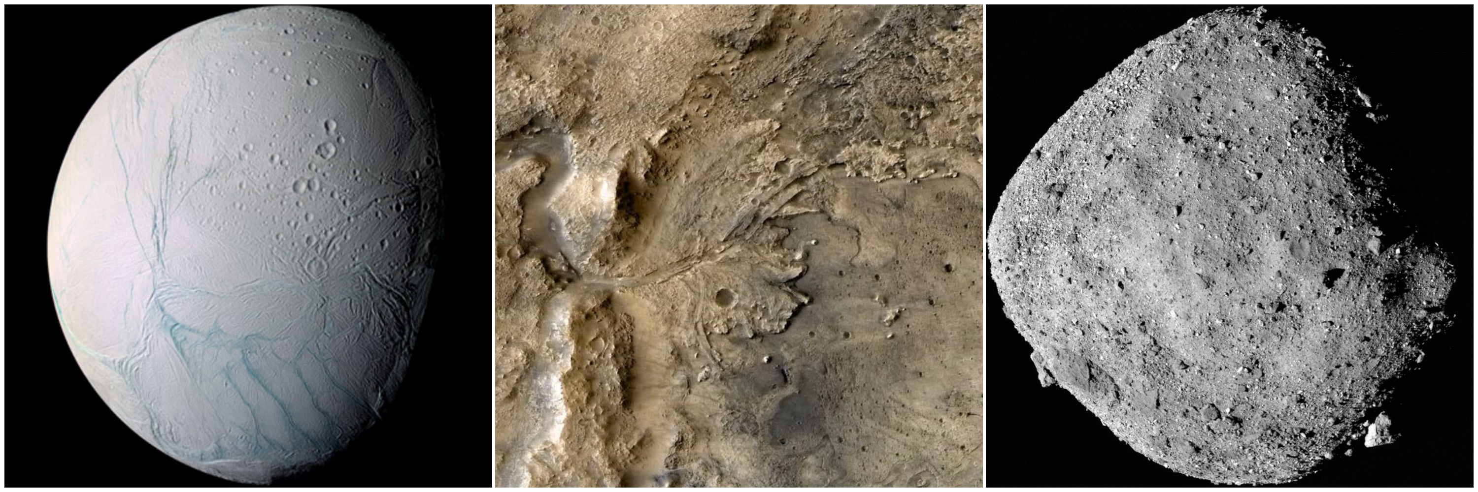“Tra i satelliti ghiacciati”, continua Lucchetti, “il caso più emblematico è indubbiamente quello di Encelado, una delle lune di Saturno. Le osservazioni della sonda Cassini hanno infatti mostrato una superficie ricoperta da uno spesso guscio di ghiaccio che si assottiglia verso il polo sud, dove quattro fratture principali, le tiger stripes (“strisce di tigre”, come quelle del manto del grande felino asiatico), emettono ciclicamente getti di vapore d’acqua, polvere e particelle di ghiaccio. Questi pennacchi, chiamati plumes, sono simili ai geyser terrestri e derivano dalle pressioni interne dell’oceano salino sotterraneo, riscaldato e mantenuto liquido dall’azione mareale di Saturno. Al contrario, il polo nord appare molto più statico, in quanto segnato da crateri, ma privo di fratture”.