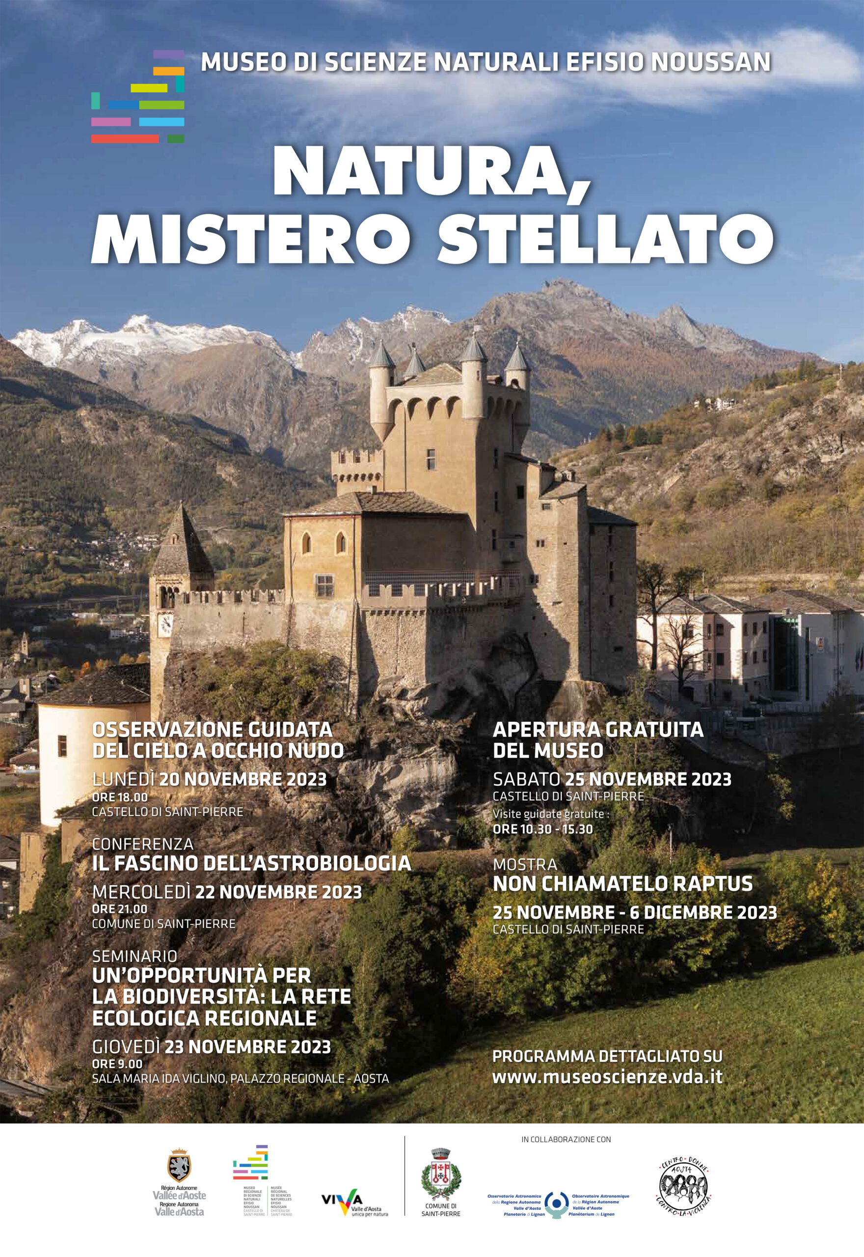 Lunedì 20 novembre la rassegna debutterà con l’osservazione del cielo ad occhio nudo dalle mura del Castello di Saint-Pierre. La serata, guidata da Katia Berlingeri e Andrea Bernagozzi, ricercatori all’Osservatorio Astronomico, sarà dedicata agli animali e ai miti delle costellazioni autunnali. Appuntamento alle ore 18.00, ingresso libero su prenotazione (museoscienze@regione.vda.it / 0165862500), fino a un massimo di 50 persone; in caso di maltempo, l’iniziativa è confermata, proponendo due turni di visita guidata tematica al Museo, tra natura terrestre e suggestioni celesti.