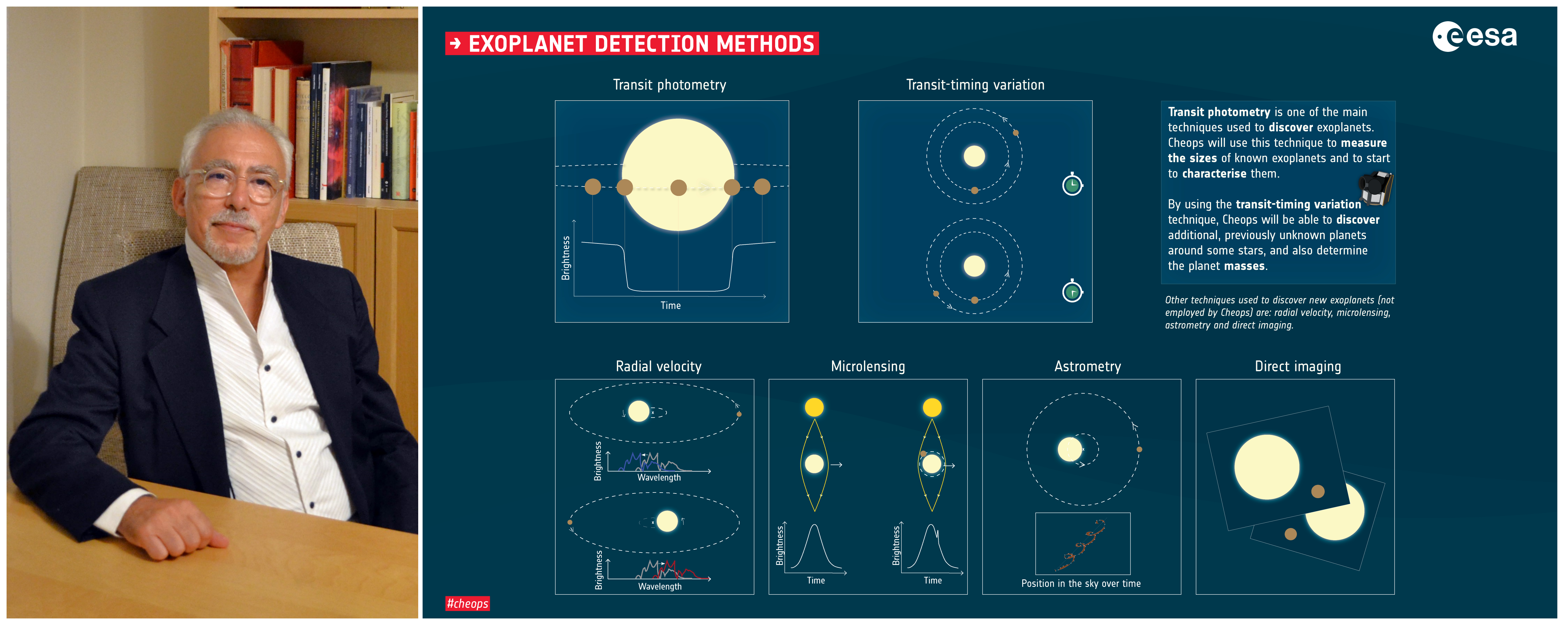 A destra, schema riassuntivo dei principali metodi per l’individuazione di esopianeti. Da in alto a sinistra, in senso orario: transito fotometrico; variazione dei tempi di transito; imaging diretto; astrometria; microlensing; velocità radiali. Credit: ESA. Fonte: https://www.esa.int/ESA_Multimedia/Images/2019/12/Exoplanet_detection_methods