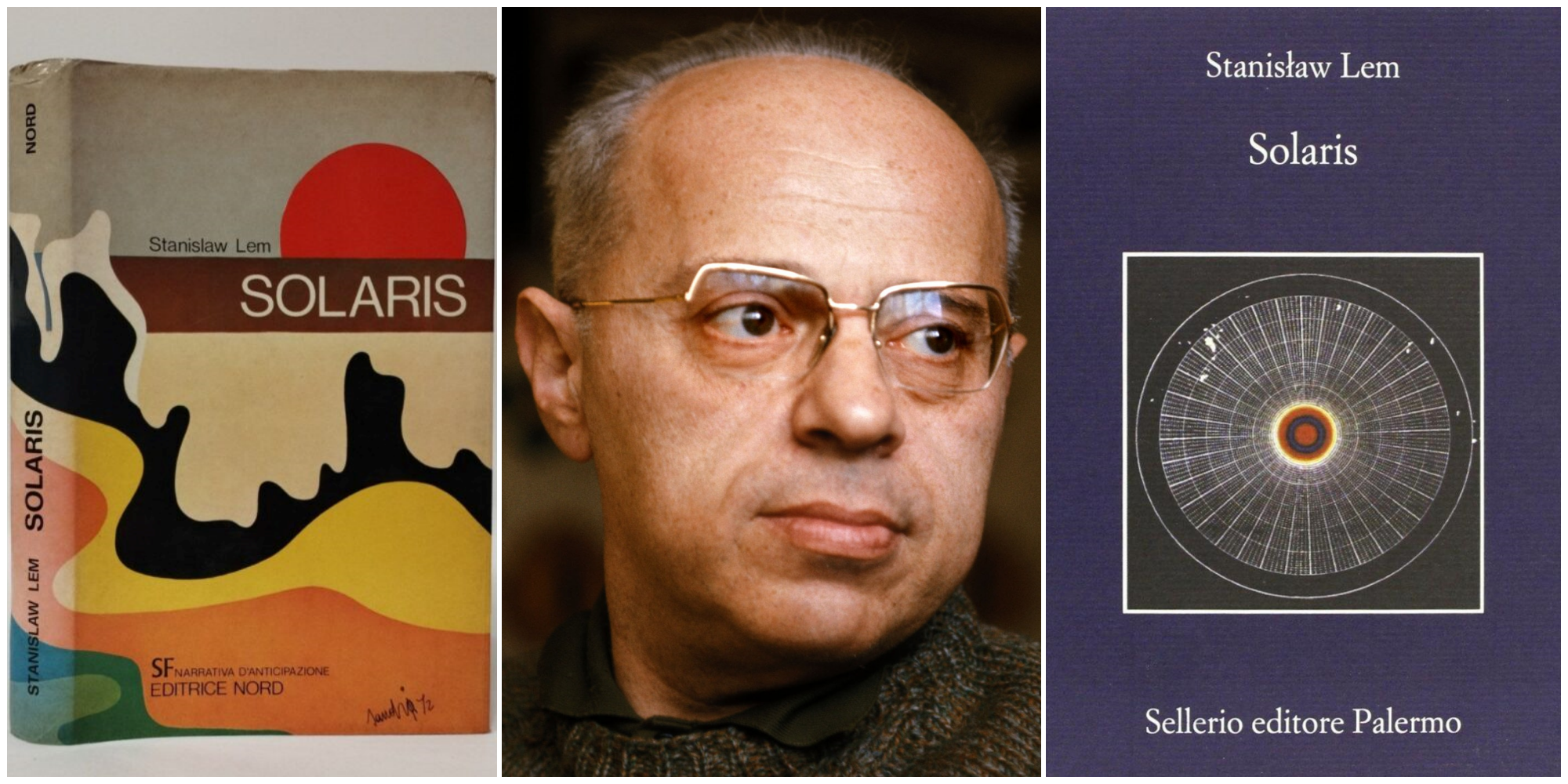 A destra, la copertina della più recente traduzione italiana di Solaris (Sellerio, 2013). Fonte: https://www.doppiozero.com/grandezza-di-stanislaw-lem
