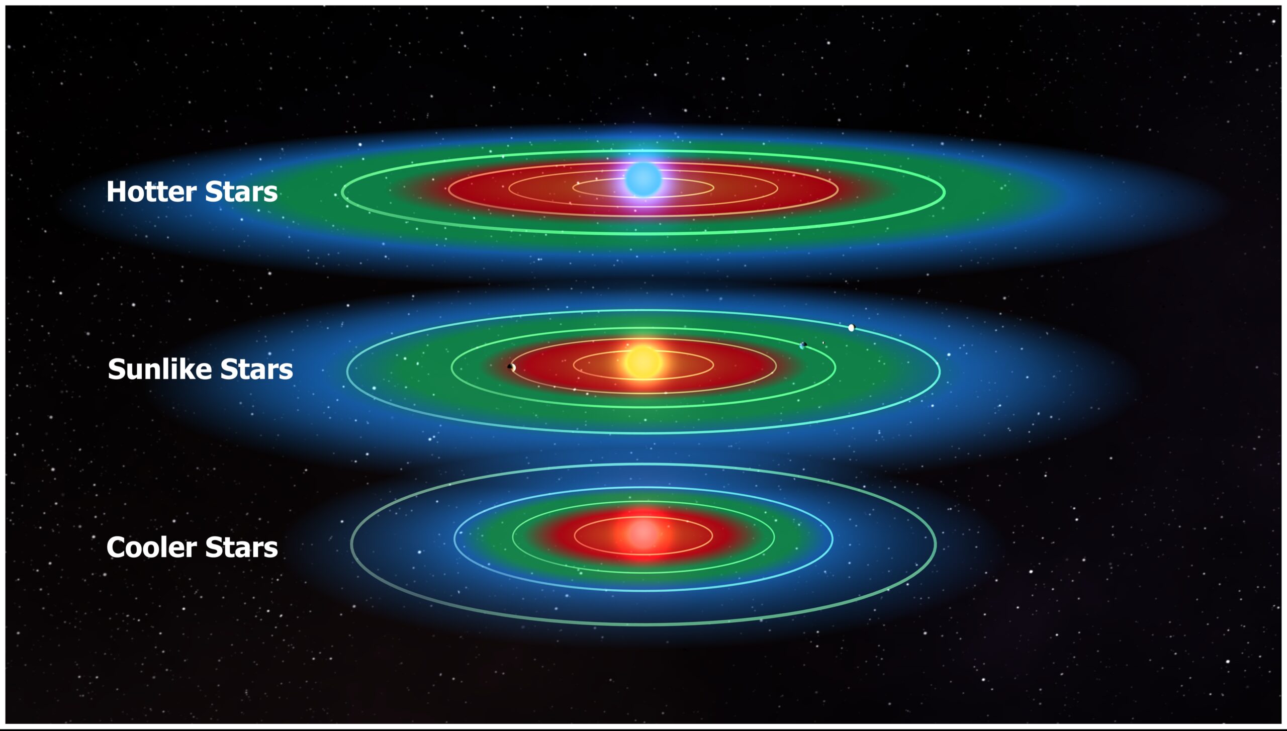 La posizione della zona abitabile dipende sia dalla luminosità e dalla fase evolutiva della stella, sia dall’atmosfera del pianeta, che tramite l’albedo e l’effetto serra può espanderla o restringerla. Per esempio, una stella di sequenza principale come il Sole irradia energia in modo quasi costante per miliardi di anni, stabilizzando la zona abitabile dei suoi pianeti. Per contro, una stella gigante rossa, più grande e luminosa, sposta la zona abitabile verso distanze maggiori, rendendo inospitali pianeti prima temperati. Infine, una stella nana rossa, la cui luminosità è molto bassa, circoscrive la zona abitabile ad aree vicine, dove i pianeti possono subire il fenomeno di tidal locking, venendo così colpiti dalla radiazione solo in uno dei due emisferi.